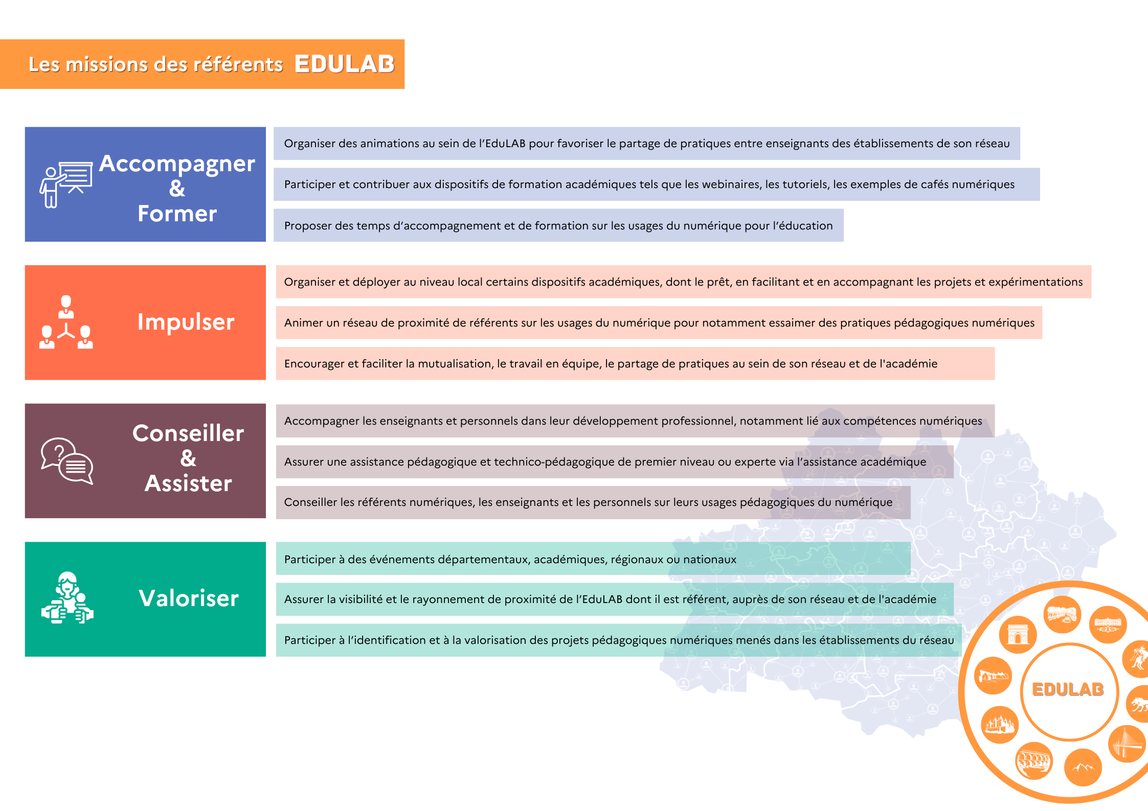 Le référent EduLAB exercent leurs missions sous l’autorité du DRANE au niveau d'un réseau d'EduLAB collèges et lycées et interviennent dans l’ensemble des collèges, lycées et circonscriptions de ce réseau. Pour notre lycée, les établissements suivants sont les collèges et lycées qui sont à droite de l'autoroute A9, côté mer.